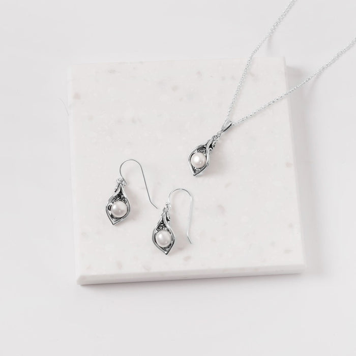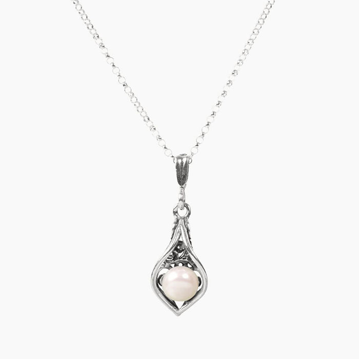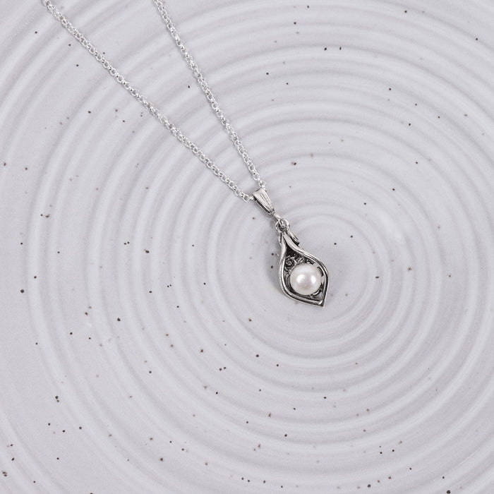 Our freshwater pearl Calla Lily pendant is a beautiful addition to any collection. The texture in the sterling silver perfectly contrasts to emphasize the smooth freshwater pearl.