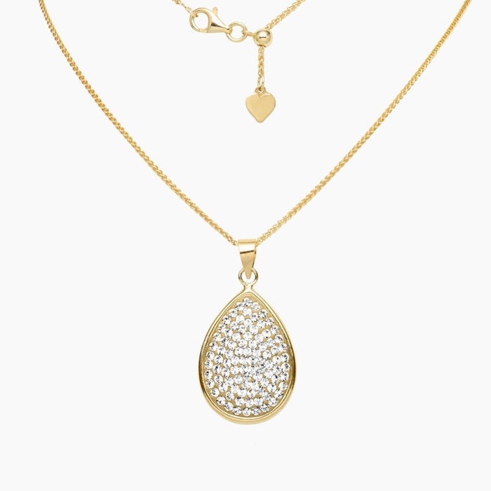 Crystals are inlaid on a beautiful sterling silver teardrop pendant, finished in 14k gold that hangs perfectly from your favorite Roma chain.