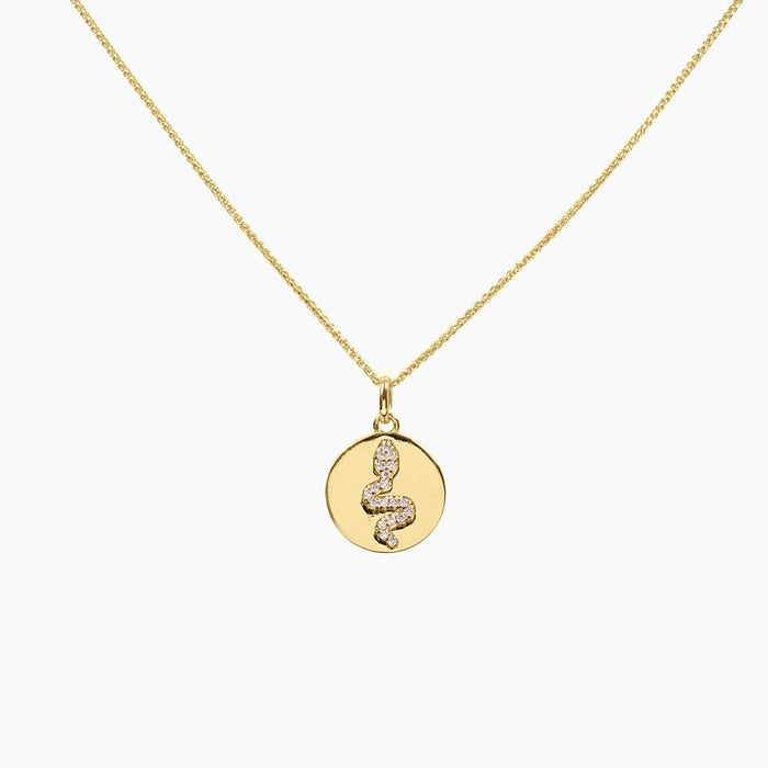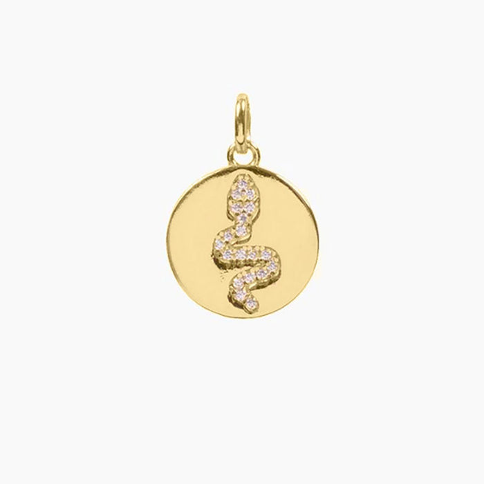 The symbol of a serpent has a long history of representing health, rebirth, wisdom, protection and many others. The 14k Gold plated disc has Cubic Zirconia embedded in the serpent shape. This unique medallion will spark the attention of anyone who sees it.