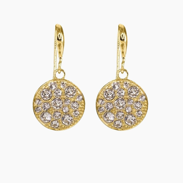 Swarovski crystals are beautifully inlaid on a 1/2" diameter sterling silver disc with gold overlay. Each earring has an elegant yet comfortable designer hook. They are sure to become a fast favorite!