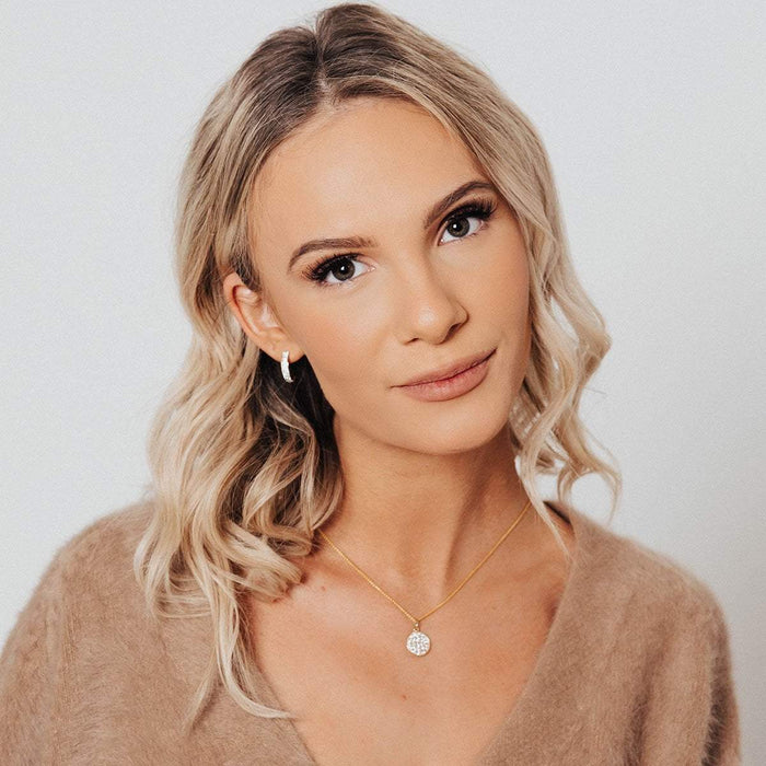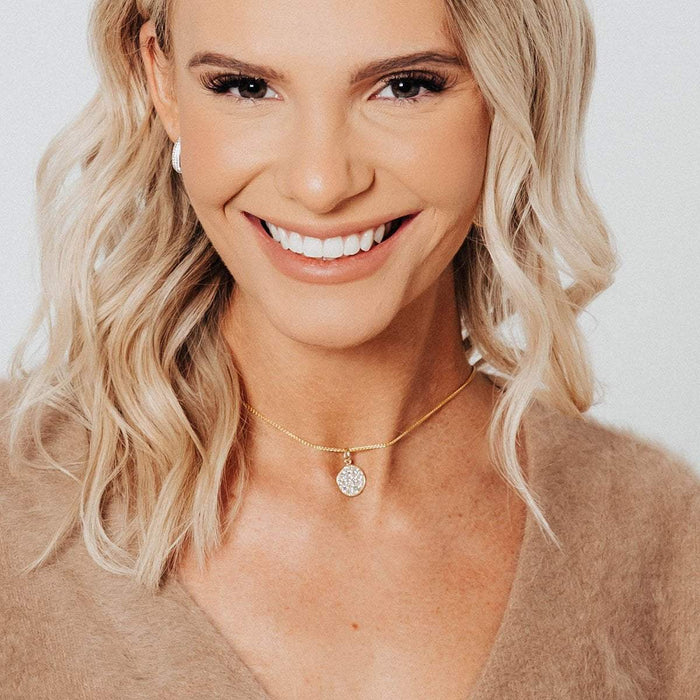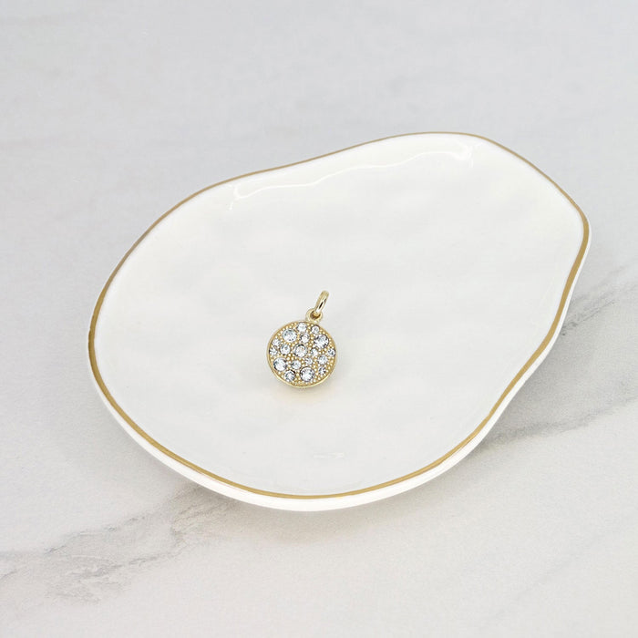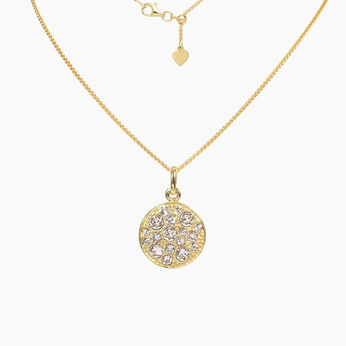 Crystals are inlaid on a dainty 1/2" diameter sterling silver disc, finished in 14k gold that hangs perfectly from your favorite Roma chain.